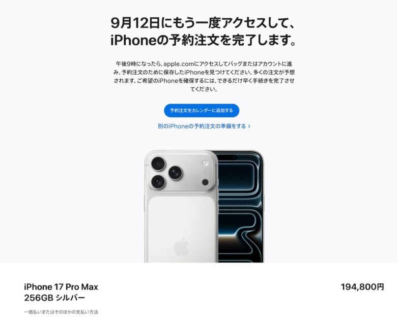 2025年はiPhone17ProMax256GBを予約開始日にApple Storeオンラインで予約しました。