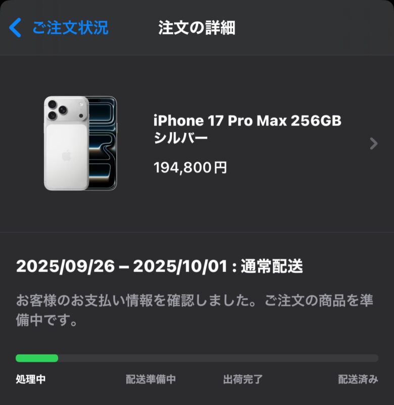 ちなみに私と同じぐらいの時間に注文した父が頼んだ「iPhone17ProMax512GBディープブルー」は1日ズレた配送ステータスでした。おそらく明日届くでしょう。