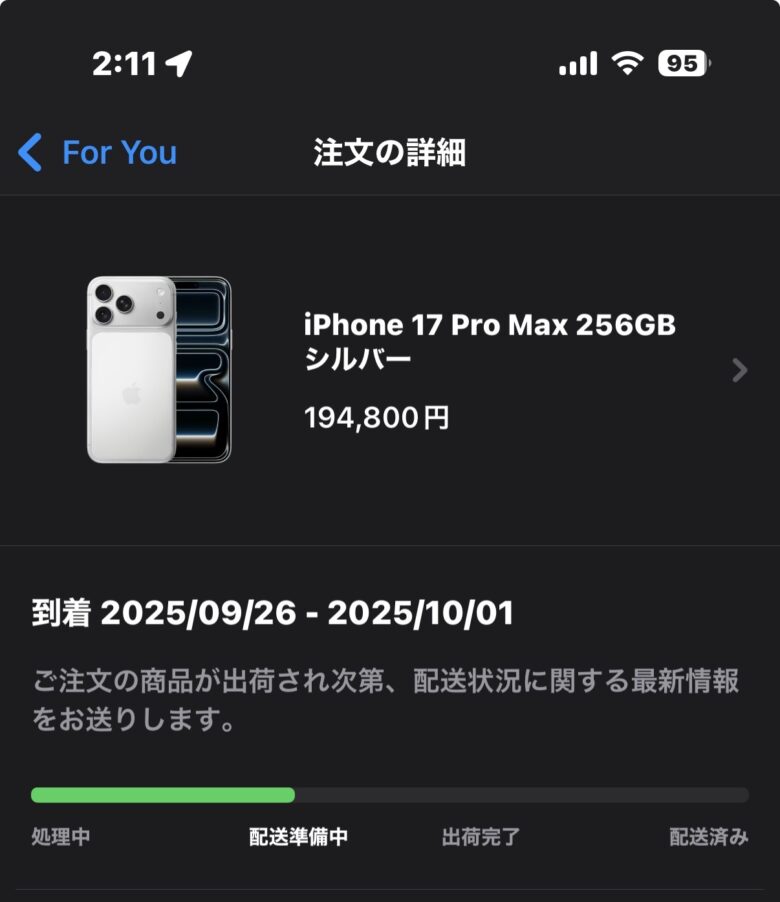 こちらの記事では、私がApple StoreオンラインにてiPhone17ProMax256GBシルバーを予約開始日に予約して何日で届くかをまとめています。(栃木県在住)