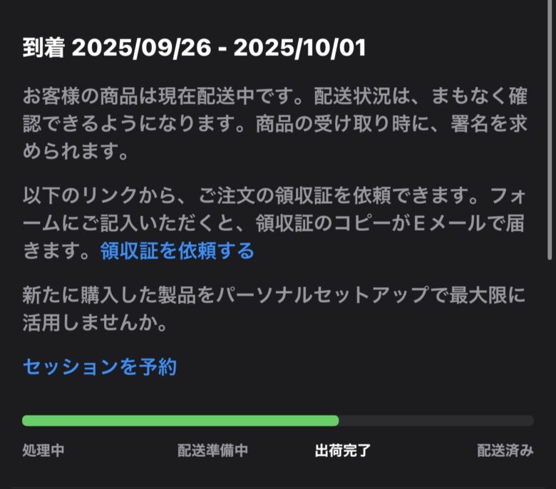 配送準備中になった翌日に出荷完了になりました!うおおおおおお!!!1
