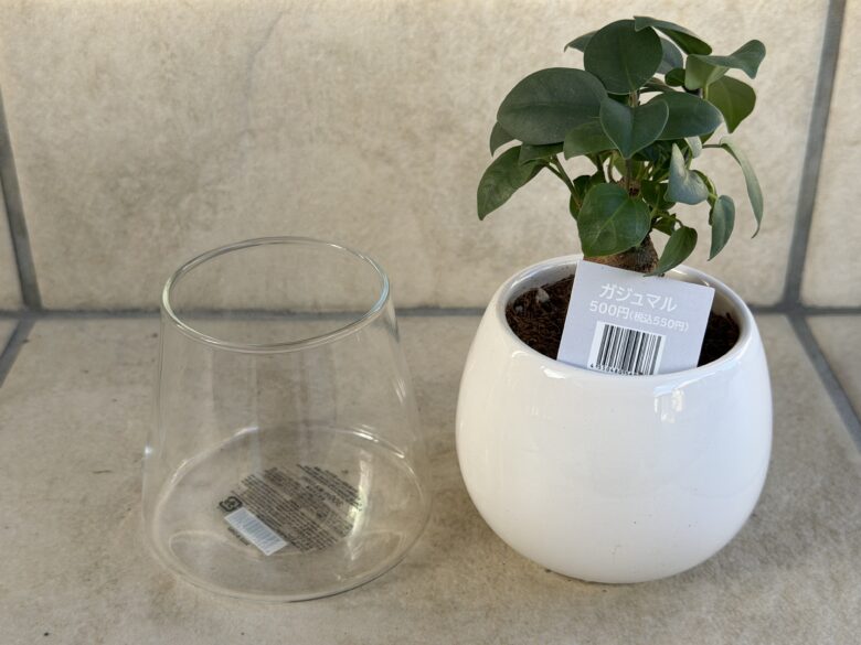 ある日、ガジュマルは水耕栽培できるしダイソーにも売っていると知り、ダイソーをハシゴして買ってきました。
