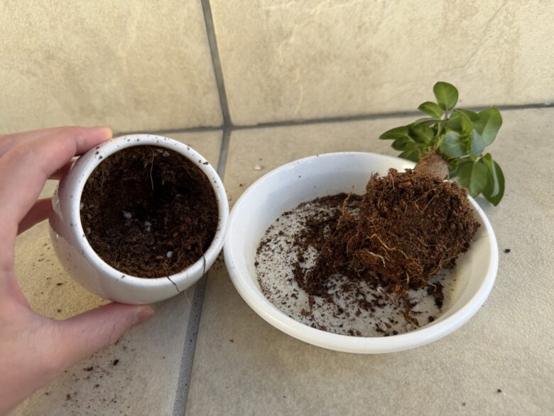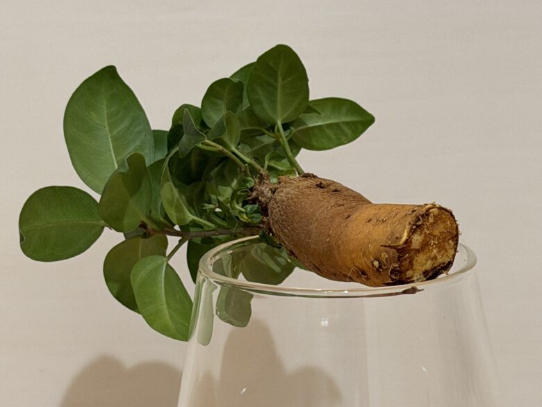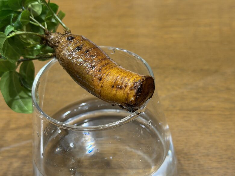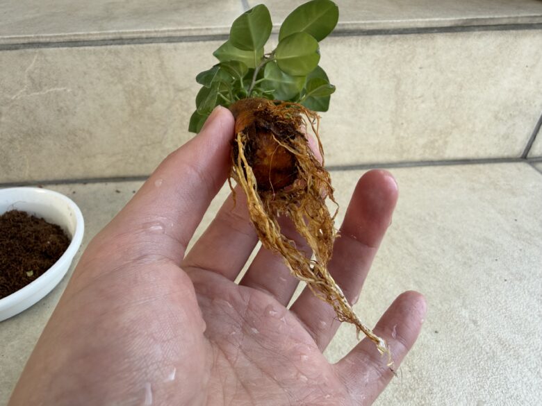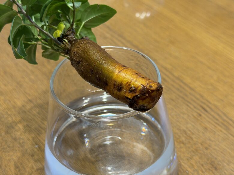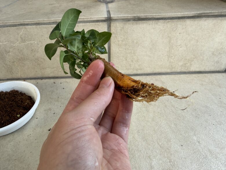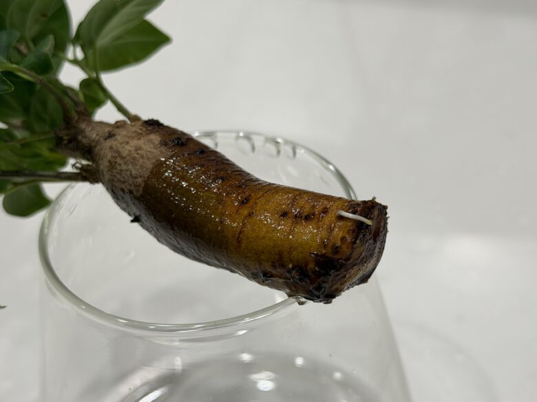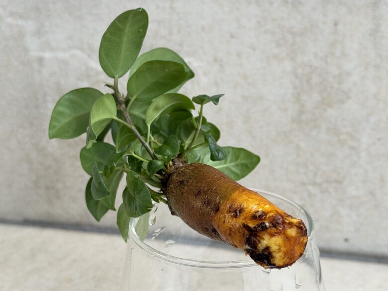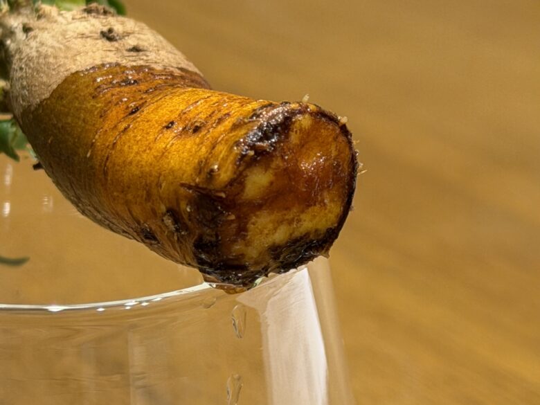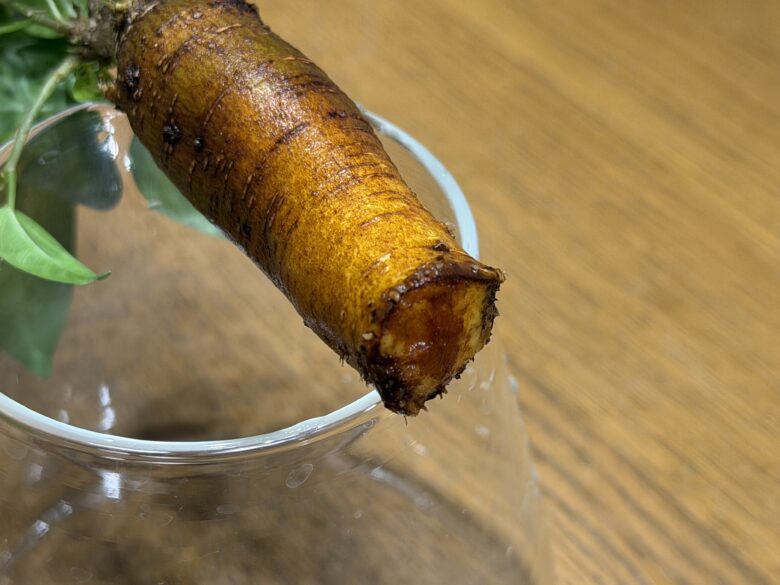 根っこを切り落とした後は、半日ぐらい日陰で乾燥させると幹がストレスを感じて根っこの成長が早くなるそうです。