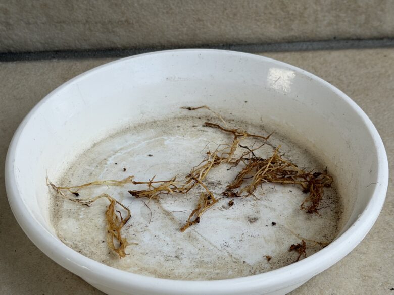 細い根っこを全部切り落としました。また元気な根っこを生やしておくれ!