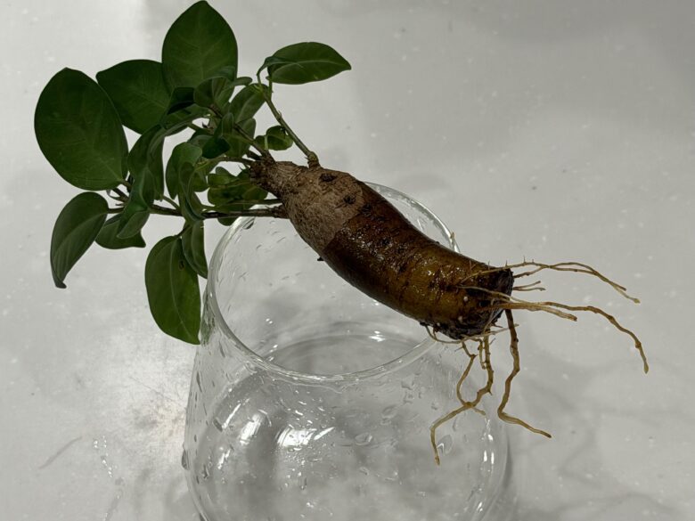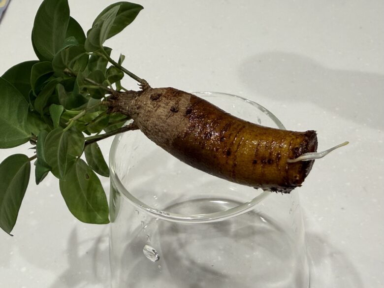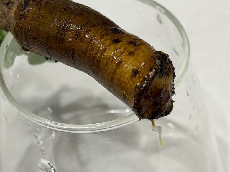 根っこを切り落とした後は、半日ぐらい日陰で乾燥させると幹がストレスを感じて根っこの成長が早くなるそうです。