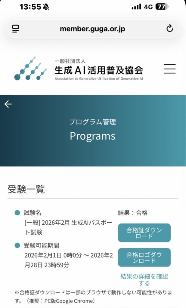 生成AIパスポート試験は合格発表日は公式サイトにはこのように表示されていました▼