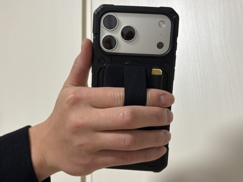 Sinjimoruのカードケースにはゴムバンドみたいな紐に指を引っ掛ければ安定しました。